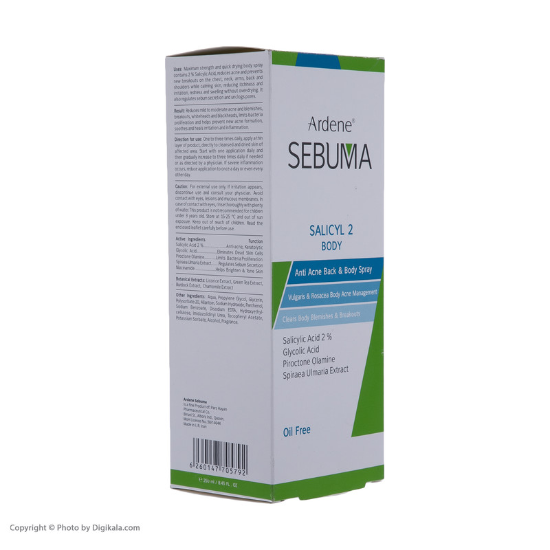 اسپری ضد جوش آردن سبوما مدل SALICYL2، یک محصول فوق العاده برای کسانی است که مشکل جوش دارند. با استفاده از این محصول از جوش های آزار دهنده و ناخوشایند خداحافظی کنید. فرمولاسیون پیشرفته این اسپری شامل سالیسیلیک اسید و بنزوئیل پراکسید است، که باعث پاکسازی عمیق پوست شما میشود. همچنین، این اسپری باعث کاهش ایجاد جوش و پوست های چربی برای شما میشود. مزایای دیگر این محصول شامل سرعت اثر و قابلیت جذب سریع در پوست، برطرف کردن جوش های قدیمی و در حال تشکیل، کاهش التهاب و درمان ضایعات پوستی میشود. همچنین، با استفاده روزانه از این اسپری، پوست شما زیباتر و تازه تر خواهد شد. اسپری ضد جوش SALICYL2 سبوما، یک محصول کارآمد و حرفهای است که در کاهش جوشهای پوست شما تاثیر بسزایی دارد. با استفاده مداوم از این محصول، پوست شما صاف و سالم میشود. این محصول را به همه کسانی که مشکل جوش دارند، به شدت توصیه میکنیم.