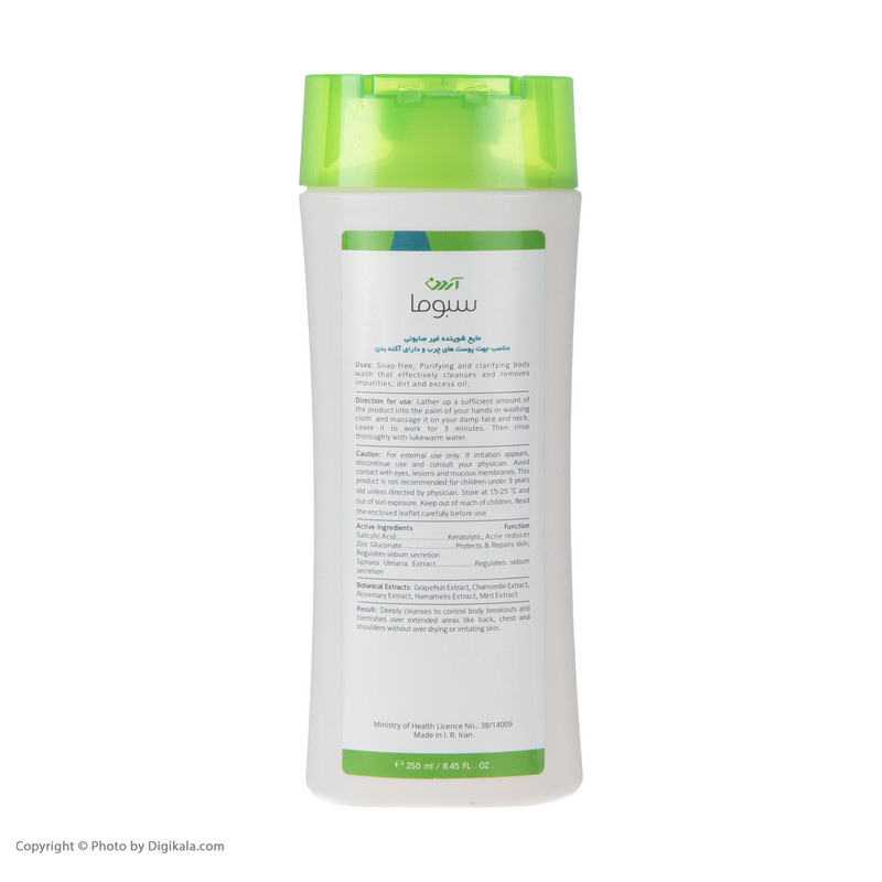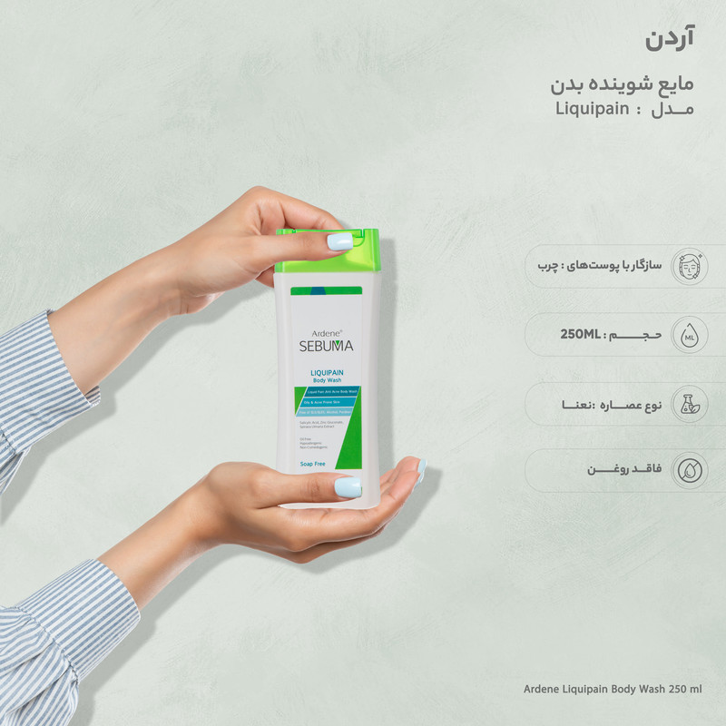 شوینده بدن فاقد مواد صابونی جهت شستشو و پاک نمودن پوست از چربی اضافی و آلودگی ها و متعادل نمودن ترشح چربی پوست که در نتیجه مصرف چربی اضافی پوست رفع و جوش و آکنه در نواحی مختلف بدن از جمله پشت، بازوها، شانه و سینه بدون ایجاد خشکی و حساسیت کاهش یافته و رفع میگردد.