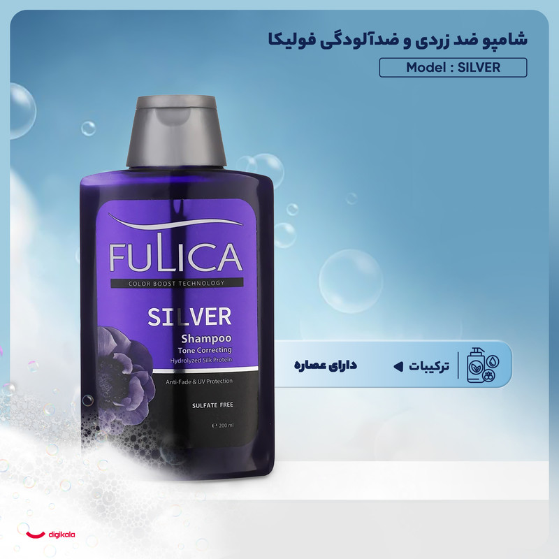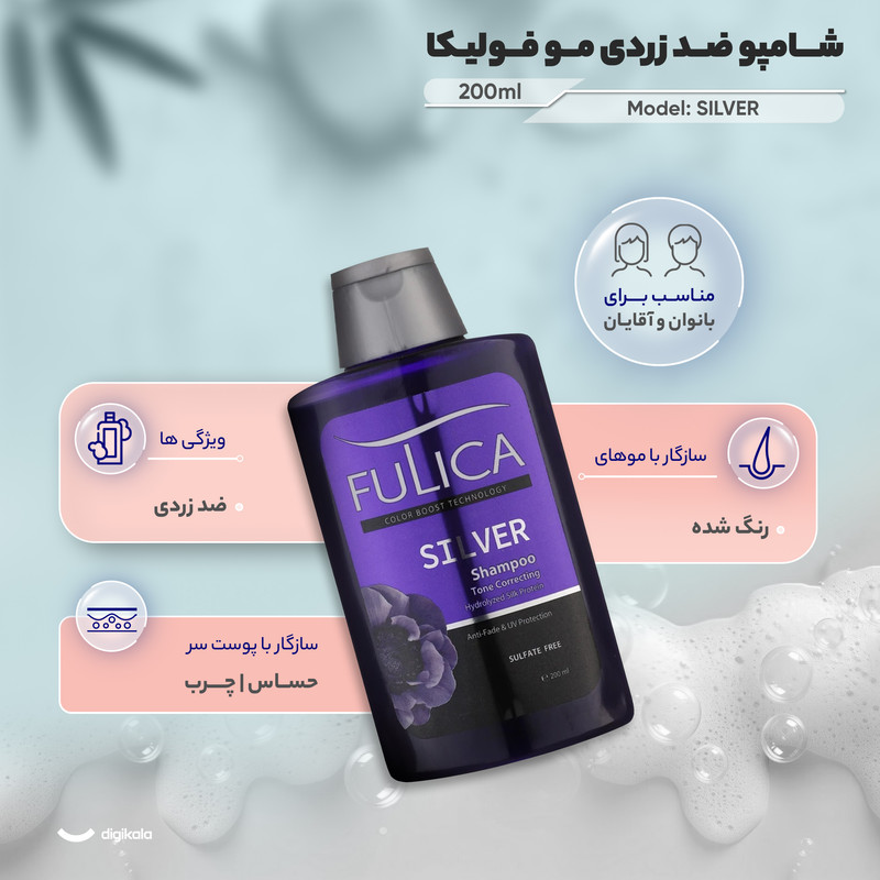 شامپو ضد زردی مو فولیکا مدل SILVER با حجم 200 میلی لیتر، یک محصول بی نظیر و بدون سولفات است که به طور خاص برای موهای دکلره و رنگ شده طراحی شده است. این شامپو با استفاده از عصاره پروتئین ابریشم، به شما کمک می کند تا زردی ناخواسته موهای رنگ شده خود را از بین ببرید و در عین حال از موهای خود در برابر اشعه های مضر UV محافظت کنید. این شامپو با ویژگی های ضد زردی و محافظ UV، موهای شما را درخشان و سالم نگه میدارد و برای بانوان و آقایان مناسب است. برای استفاده از شامپو ضد زردی مو فولیکا مدل SILVER، مقدار مناسبی از شامپو را روی موهای خیس خود بمالید و به آرامی ماساژ دهید تا کف کند. سپس به مدت 5 تا 10 دقیقه صبر کنید تا ترکیبات موثر شامپو به خوبی جذب شده و زردی موها از بین برود. در نهایت، موهای خود را به طور کامل با آب ولرم بشویید. برای بهترین نتیجه، این شامپو را مواقعی استفاده کنید که تاثیر آن از روی موها رفته باشد و از استفاده مکرر آن بپرهیزید. با استفاده از این شامپو، موهای رنگ شده شما نه تنها از زردی ناخواسته خلاص می شوند، بلکه با تغذیه و تقویت پروتئین ابریشم، نرم و لطیف خواهند شد. مجوز این محصول از سازمان غذا و دارو است و با اطمینان از کیفیت و ایمنی آن می توانید از آن استفاده کنید. شامپو ضد زردی مو فولیکا مدل SILVER، انتخابی عالی برای حفظ زیبایی و سلامت موهای رنگ شده شماست.