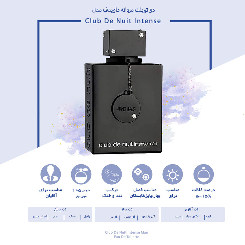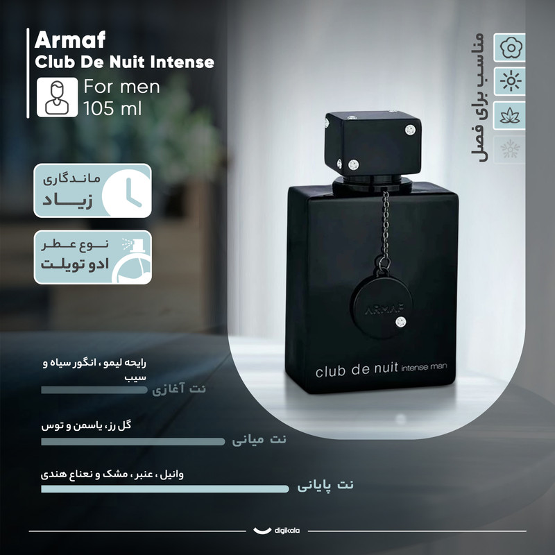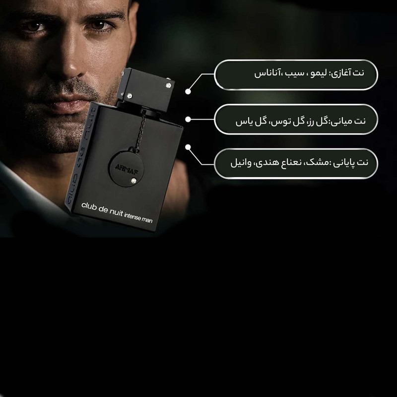 ادو تویلت مردانه آرماف مدل Club De Nuit Intense Man با حجم 105 میلی لیتر، طرفداران زیادی در بین آقایان دارد. این عطر با رایحهای خنک و تند، حس قدرت و اعتماد به نفس را در فرد ایجاد میکند. نت آغازی این عطر با ترکیبی از لیمو، انگور سیاه و سیب آغاز میشود که حس تازگی و شادابی را در شما به وجود میآورد. در نت میانی، گل رز، یاسمن و توس حضور دارند که اعتماد به نفس و جاذبه را در فرد به اوج میرسانند. نت پایانی این عطر شامل وانیل، عنبر، مشک و نعناع هندی است که عمق و استحکام را به عطر اضافه میکند. ساختار رایحه این عطر شامل میوه، گل و ادویههاست که تنوع و تعادل خاصی به عطر میبخشد. ادو تویلت آرماف Club De Nuit Intense Man با حجم 105 میلی لیتر، به عنوان یکی از محصولات محبوب این برند، دارای مجوز سازمان غذا و داروی کشور است. بنابراین، میتوانید با اطمینان کامل از کیفیت و اصالت این عطر مطمئن شوید. این عطر مناسب برای استفاده در هر فصلی است و به خصوص در فصلهای بهار، تابستان و پاییز، تازگی و انرژی خاصی را به شما میبخشد. جذابیت و جاذبه این عطر، آن را برای آقایانی که به دنبال استفاده از یک عطر خاص و ماندگار هستند، مورد علاقه قرار میدهد.