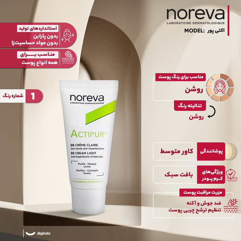بیبی کرم رنگی اکتی پور نوروا (Noreva ACTIPUR BB Cream) محصولی با پوشانندگی مناسب برای پوشاندن نواقص پوست است. این کرم علاوه بر کنترل چربی و ترشحات پوست، به حفظ رطوبت آن نیز کمک میکند. BB کرم اکتی پور سبک و راحت است و هیچ حس چسبندگی یا چربی روی پوست ایجاد نمیکند. رنگ این محصول روشن بوده و جلوهای طبیعی به پوست میدهد.